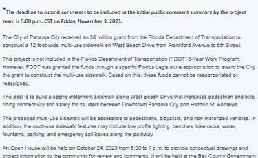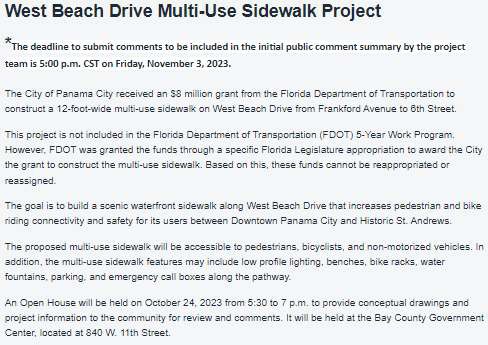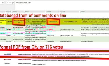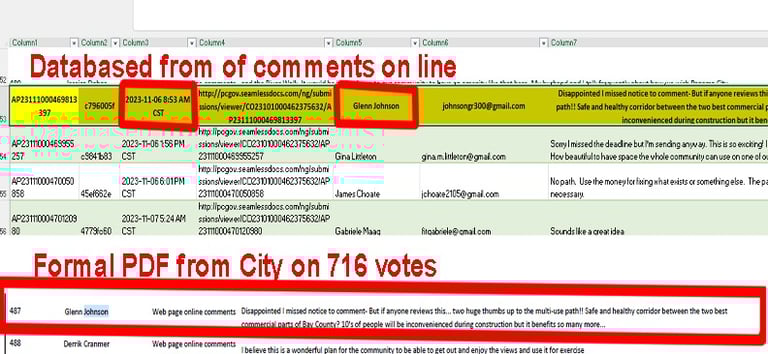 06 November: PreserveBeachDrive.com, in representing the community, sent all commissioners and the Mayor an email with petitions attached stating 1300 people were against the multi-use path (Artifact "E" below). Why was our preservebeachdrive.com neighbors input not considered or added yet the commissioners allowed input from 06 November; AFTER the City identified deadline?