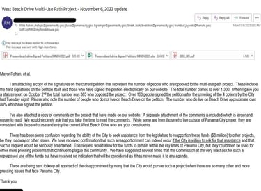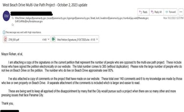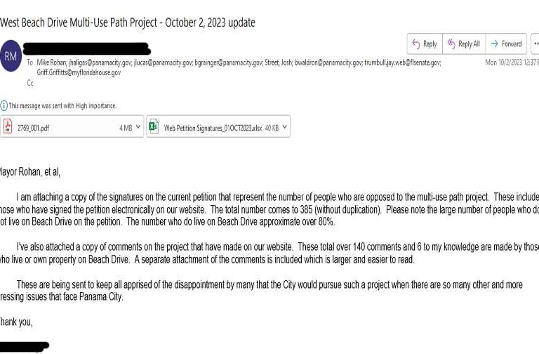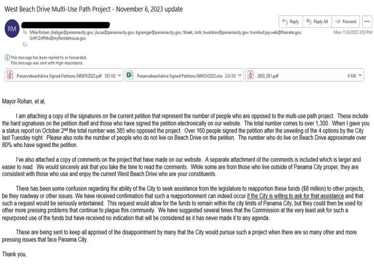 02 October: PreserveBeachDrive.com, in representing the community, sent all commissioners and the Mayor an email with petitions attached stating 348 people were against the multi-use path (Artifact "A" below).